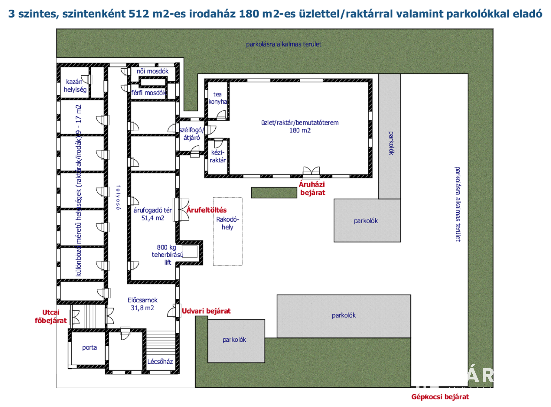 3 szintes, szintenként 512 m2-es irodaház 180 m2es raktárral
