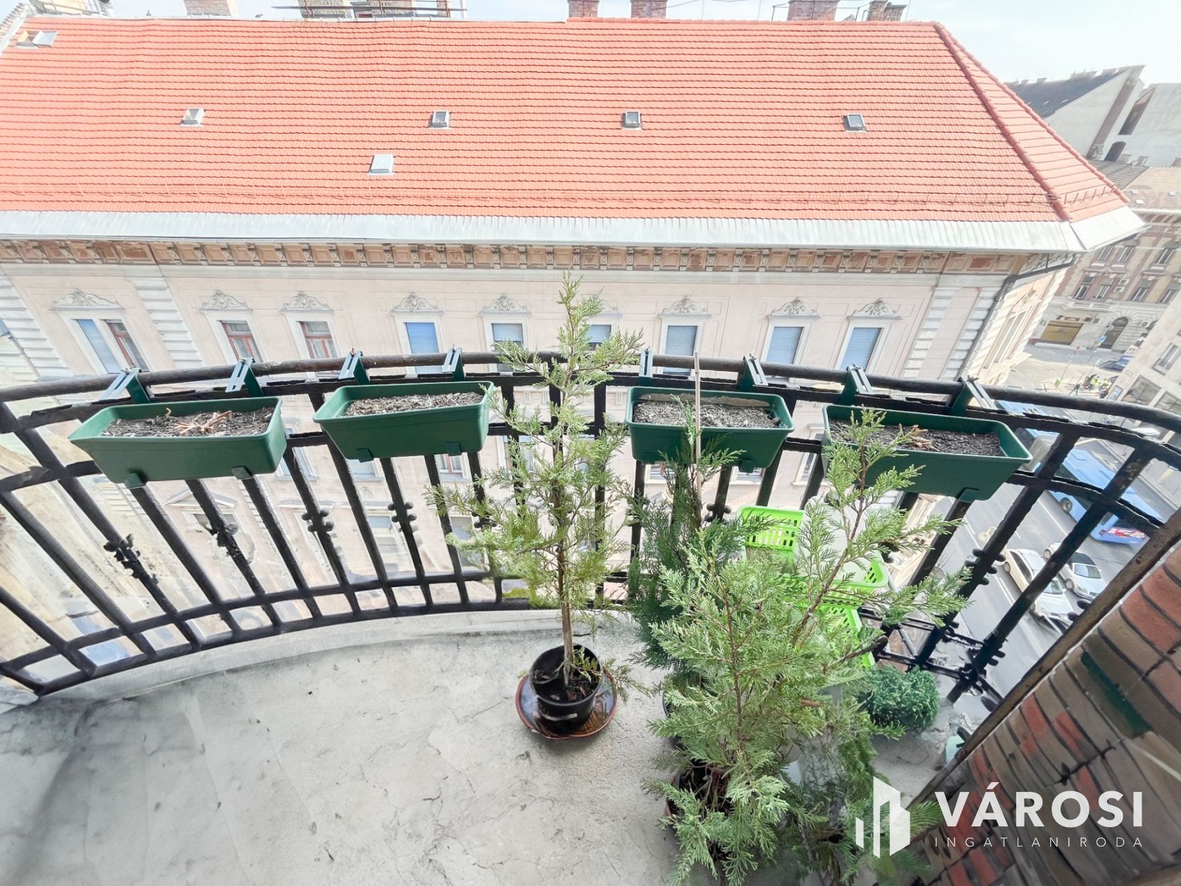 Közel 3nm-es erkély mely a mellékutcára, kisebb részben a Rákóczi útra tekint.