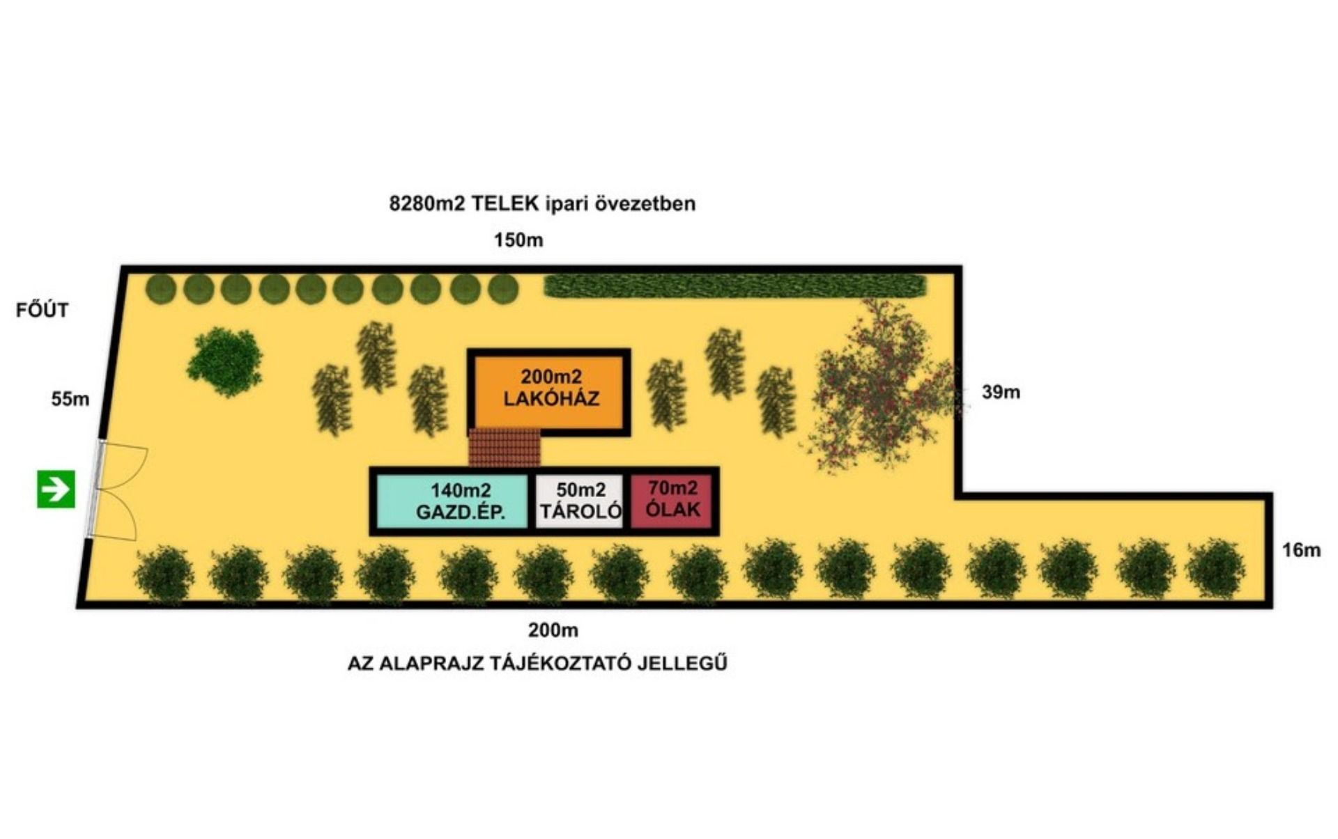 8280 m²-es mezőgazdasági, ipari és lakhatási célra is kiváló adottságú körülkerített birtok, ipari-gazdasági övezetben fekszik, 50%-os beépíthetőségi lehetőséggel bír, főútvonalhoz közvetlen kapcsolódik, több épületből áll: