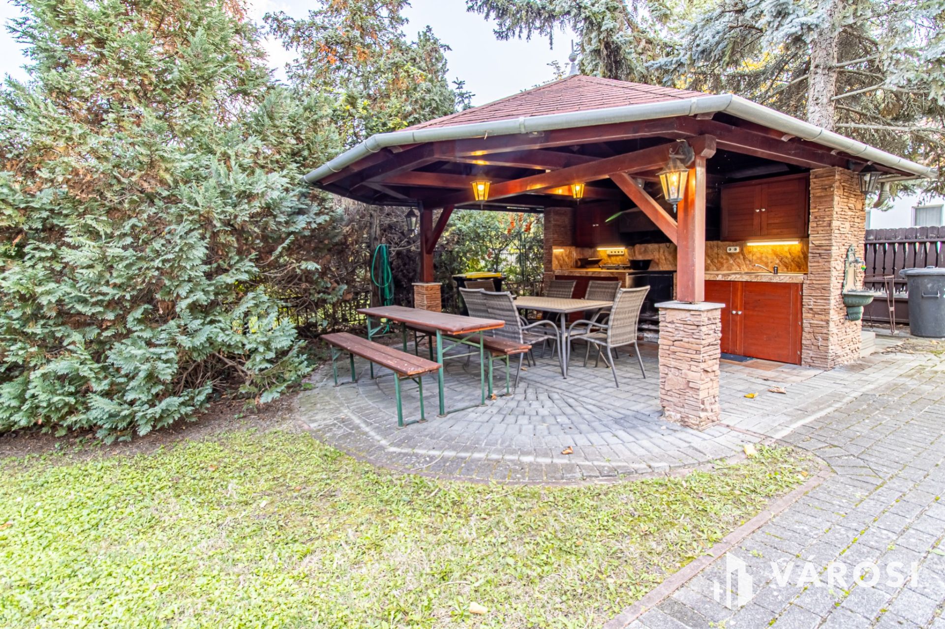 The landscaped garden offers a pleasant relaxation area with a barbecue house, outdoor shower, and a drilled well—the water supply allows for the installation of a swimming pool if desired.