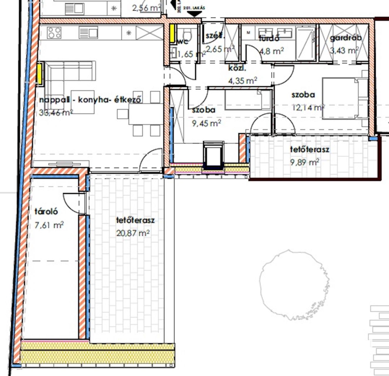 A 1 db amerikai konyhás nappalival, 2 db hálószobával, 1 db fürdőszobával, közlekedőkkel, gardróbbal, loggiával és terasszal rendelkezik.