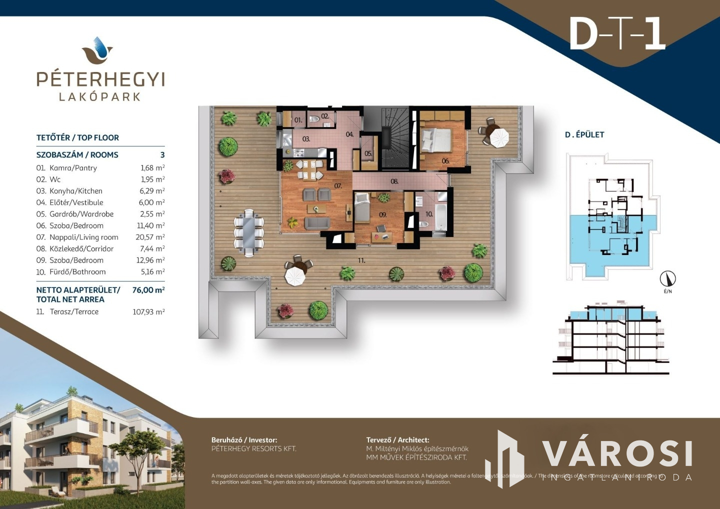 A lakópark 12 épületből áll, mindegyik 3 emeletes, liftes. A penthouse lakások a 3. emeleten találhatóak, épületenként maximum két lakás, nagy terasszal és panorámás budai kilátással!