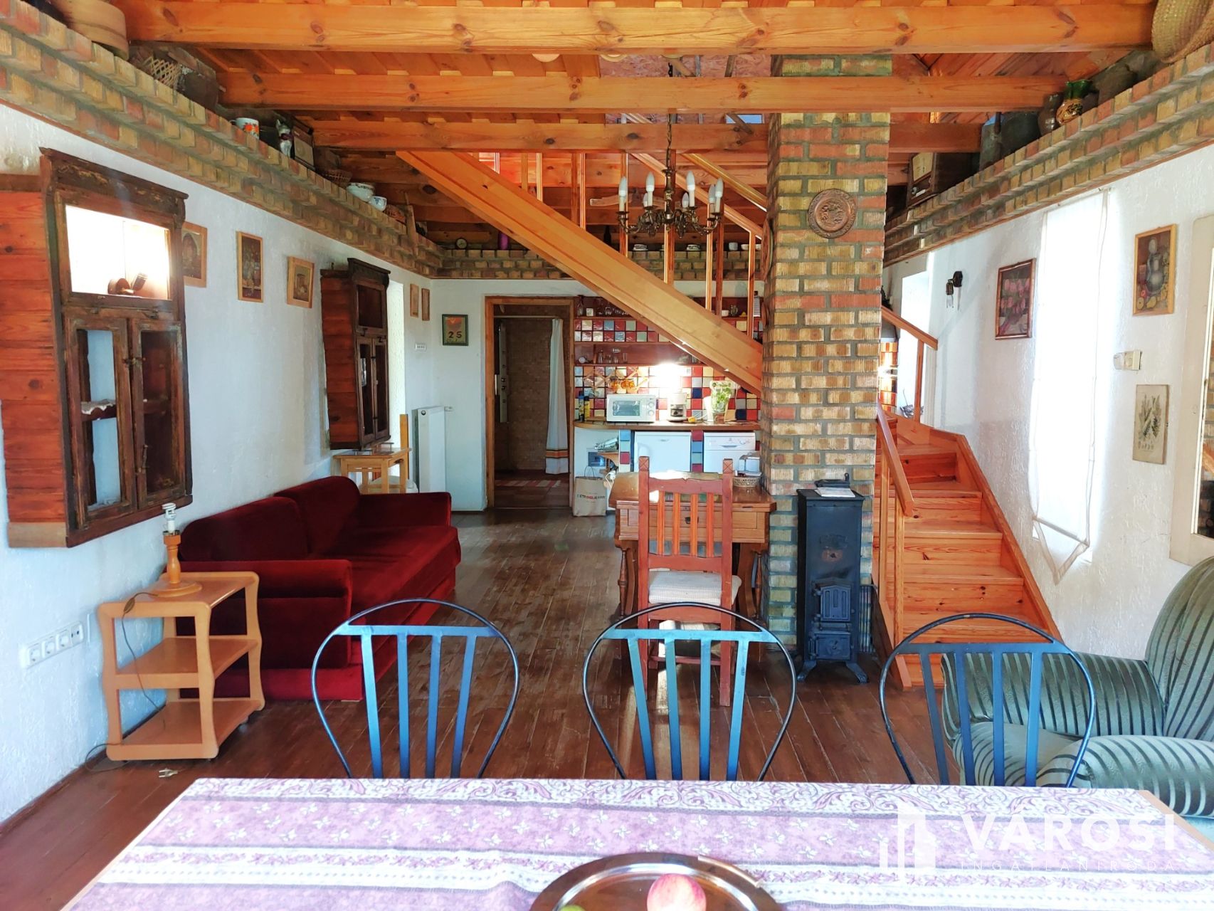 A földszinten 35m2 toszkán stílusban megálmodott nappali-konyha-étkező, tágas fürdőszoba és recepció található. A konyhasarok színes, mázas csempével kirakott, vidám, hangulatos éke az egész lakásnak. Telis-tele a ház éveken át gyűjtögetett régiségekkel, antik tárgyakkal. Ha szeretnék ezt az elbűvölő ingatlant teljes berendezéssel megvásárolni, mángorlóval, szakajtóval együtt, az külön megegyezés tárgyát képezi...